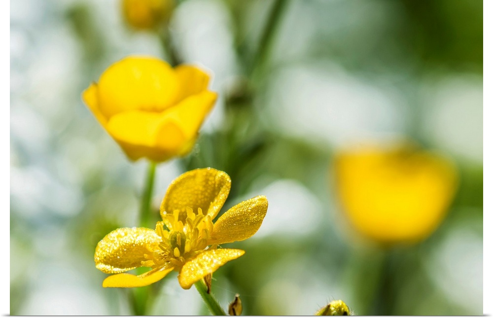 <p>Buttercup (Ranunculus) Petals Collect Dew In The Morning; Astoria, Oregon, United States Of America</p>
