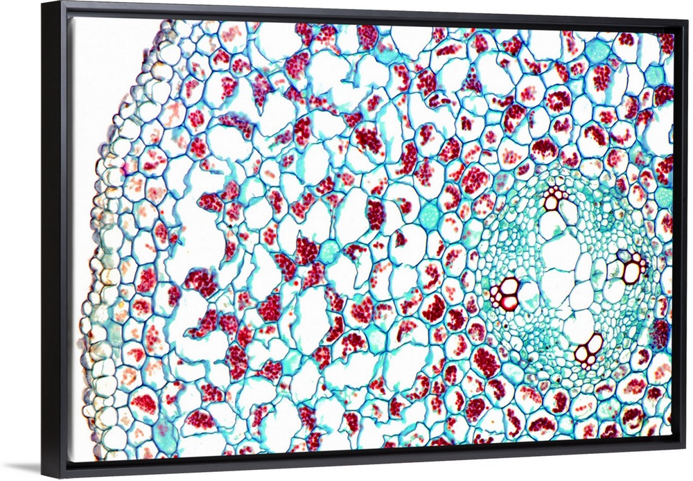 <p>Buttercup stem. Coloured light micrograph of a section through a buttercup stem (Ranunculus sp.) showing the circular-shaped vascular bundle (right). The large white circles in this bundle are the cells of the xylem (green), which transports water and mineral nutrients from the roots throughout the plant. The smaller circles within this bundle are cells of the phloem, which transports carbohydrates and plant hormones around the plant. The xylem and phloem are surrounded by very large parenchyma cells, which support the stem. Magnification: x30 when printed at 10cm wide.</p>
