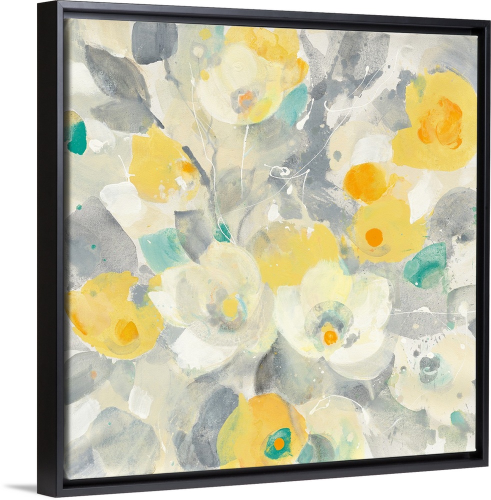 <p>Square contemporary painting of a group of flowers in washed shades of grey and yellow with teal accents.</p>
