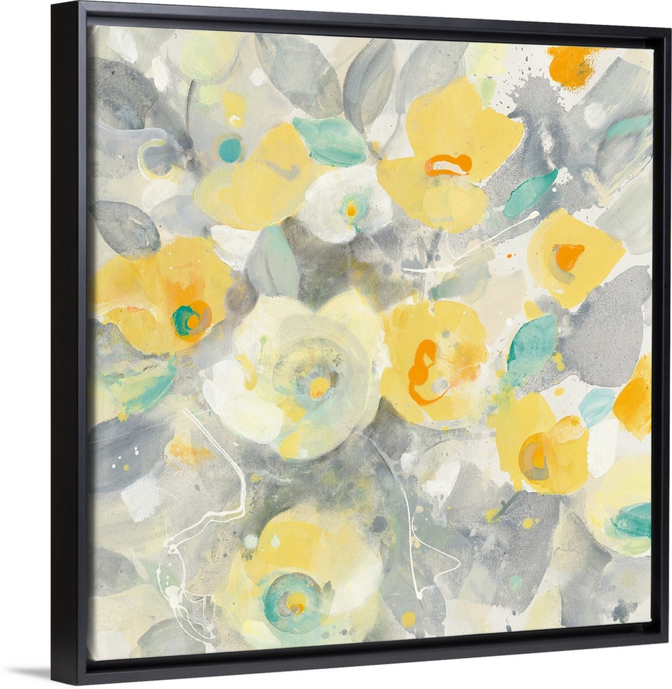 <p>Square contemporary painting of a group of flowers in washed shades of grey and yellow with teal accents.</p>