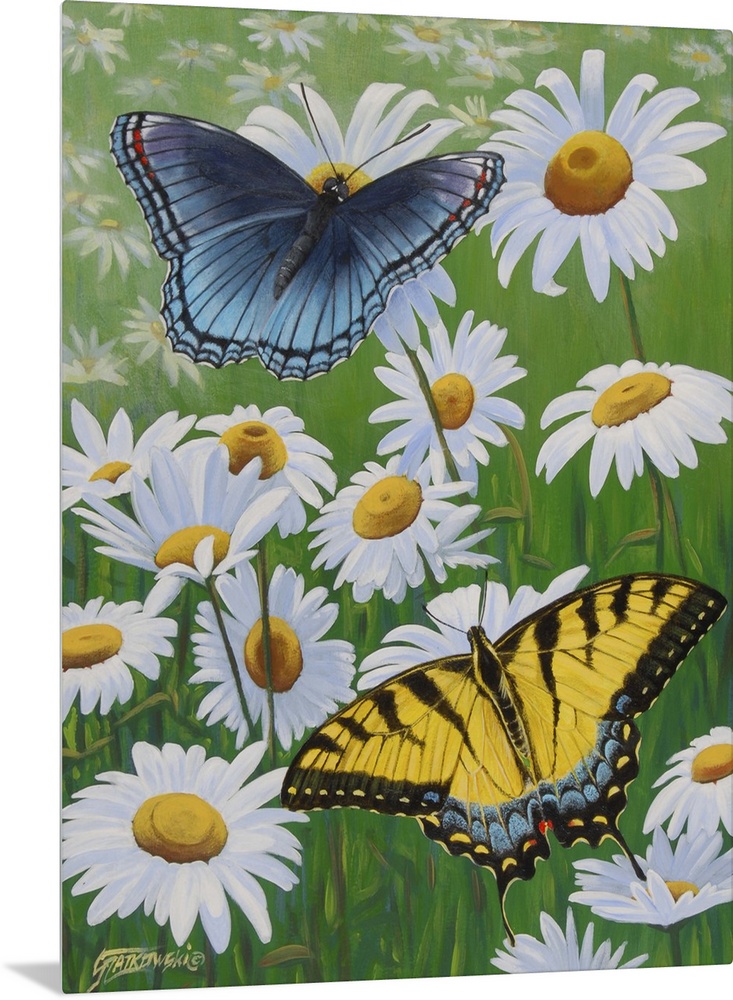 <p>Contemporary painting of two swallowtail butterflies perching on daisy flowers.</p>