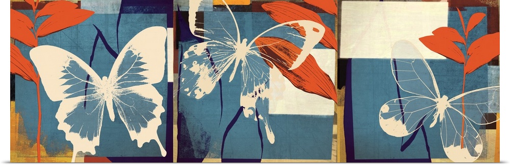 <p>A panoramic image of white butterflies against layered vibrant shapes with leaf accents.</p>