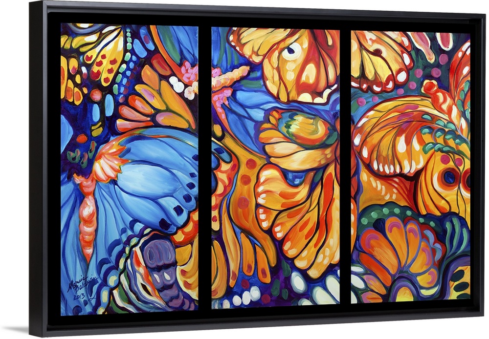<p>Painting split into three sections of vibrant butterflies.</p>