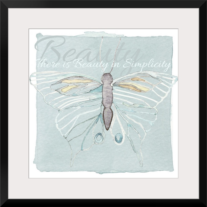 <p>Decorative watercolor painting of a butterfly with white outlined wings, and the phrase "There is beauty in simplicity."</p>