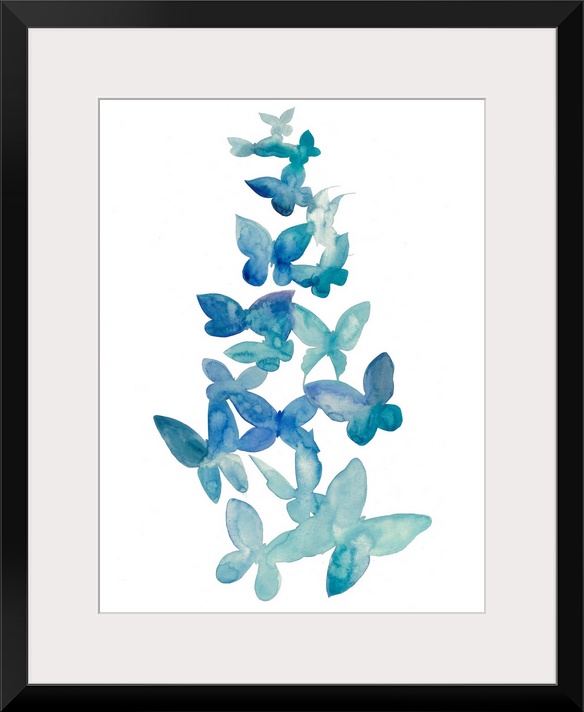 <p>Blue watercolor butterflies ascending against a white background.</p>