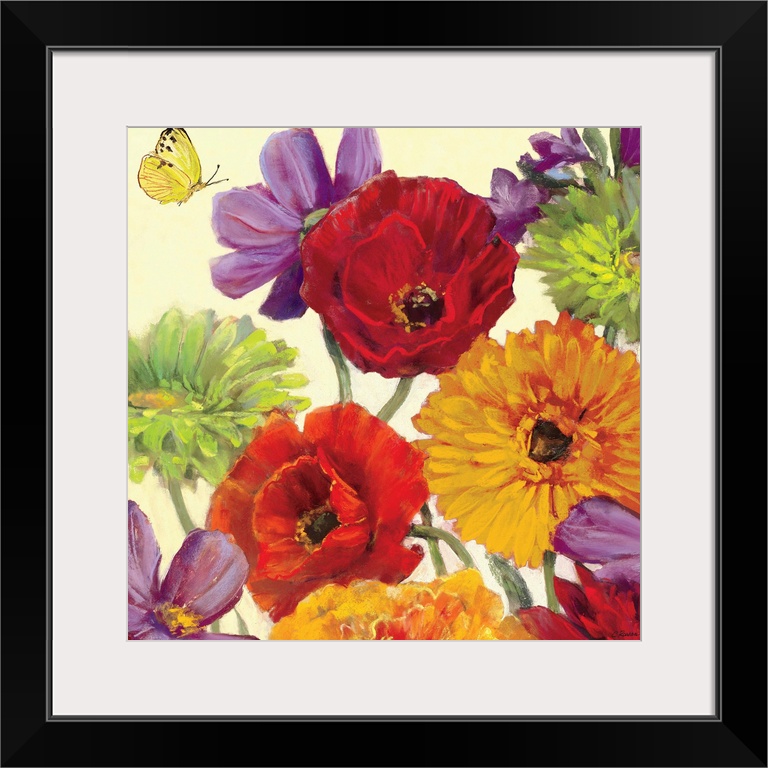 <p>Contemporary artwork of different brightly colored flowers close-up in the frame of the image.</p>