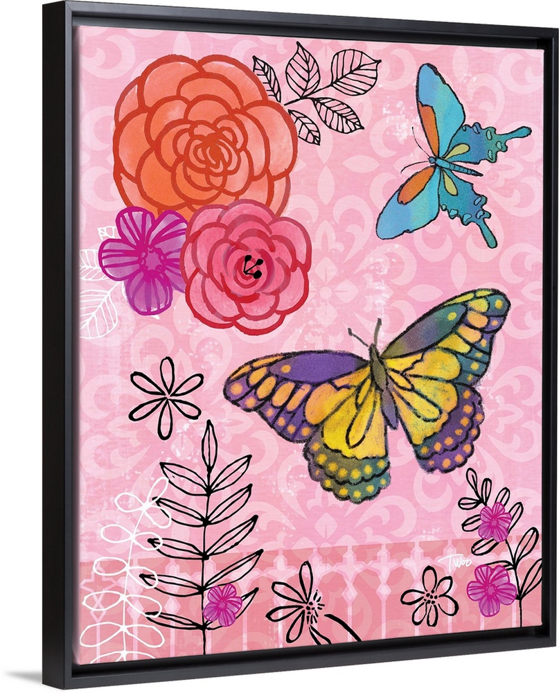<p>Whimsy illustration of butterflies and flowers on a light pink patterned background.</p>