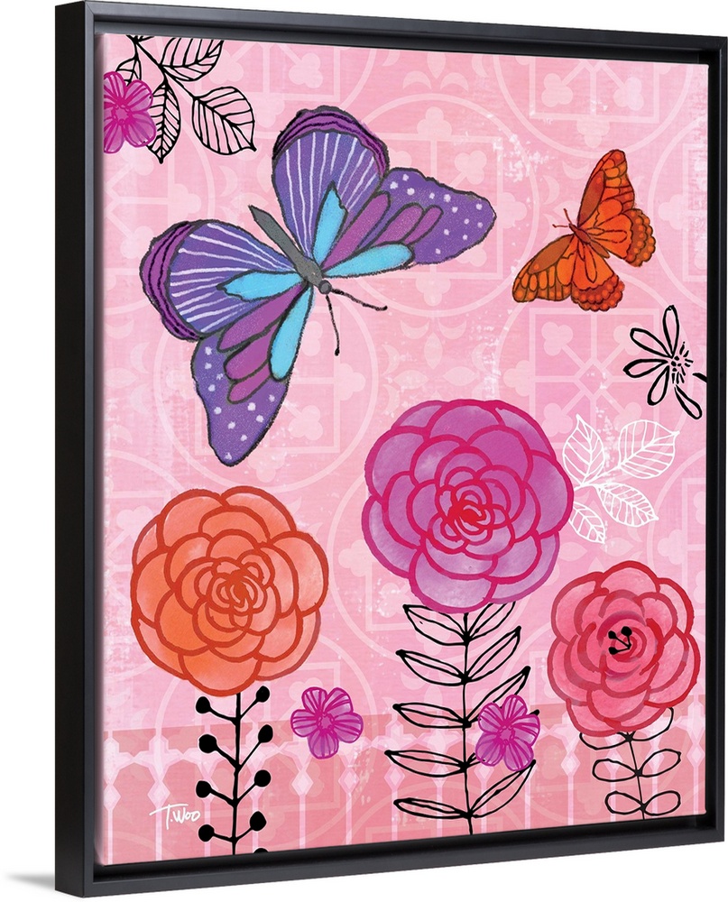 <p>Whimsy illustration of butterflies and flowers on a light pink patterned background.</p>