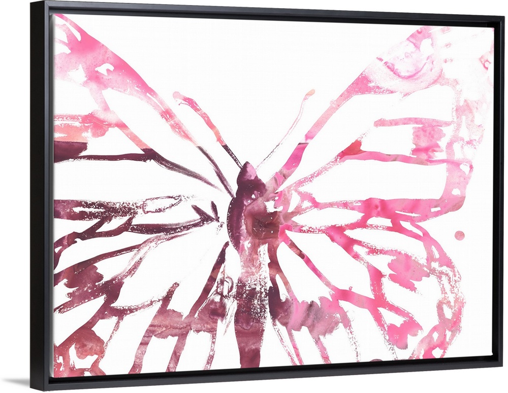 <p>An abstracted painted image of a butterfly in shades of hot pink and burgundy on a white background, in the style of an ink stamp.</p>