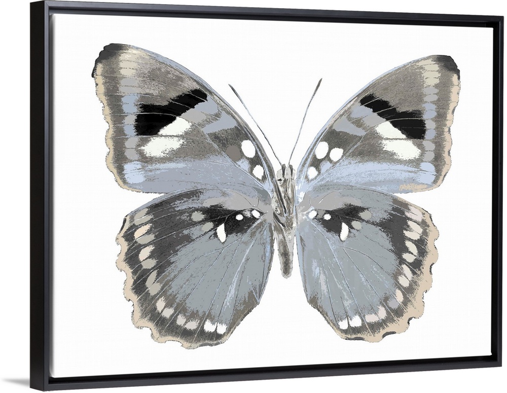 <p>Illustration of a blue, gray, black, and white butterfly on a white background.</p>