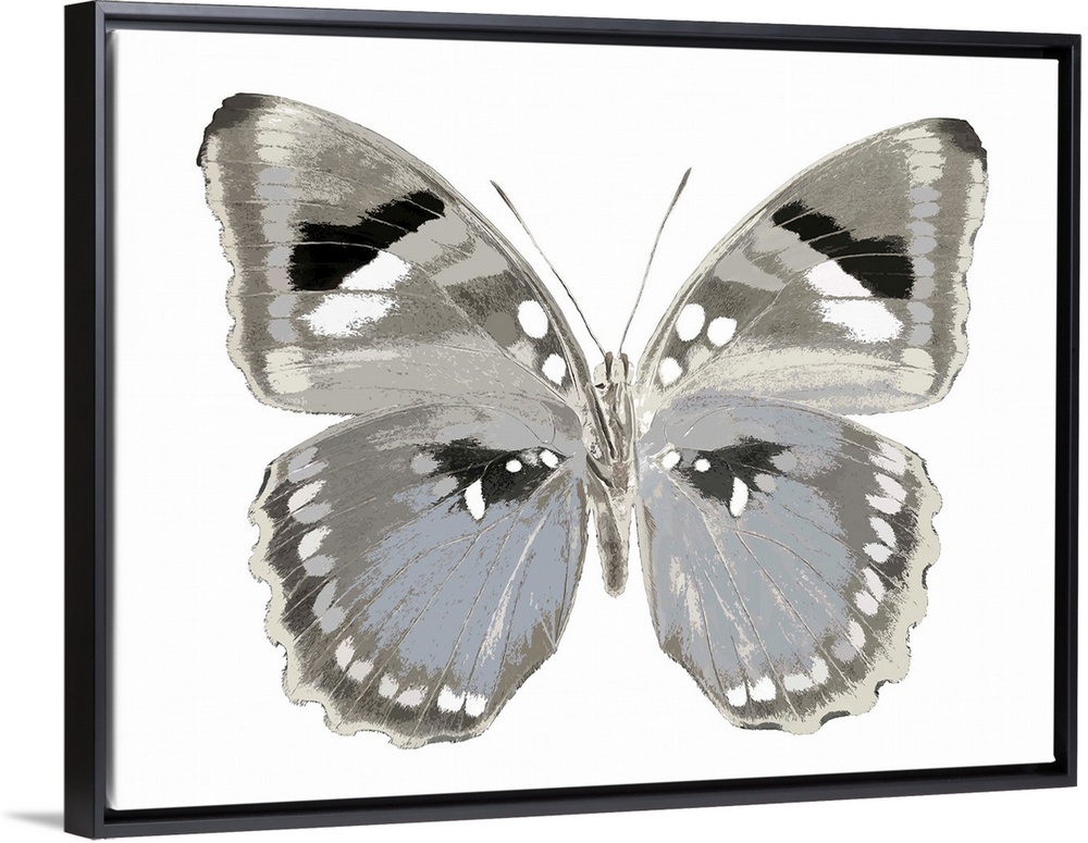 <p>Illustration of a blue, gray, black, and white butterfly on a white background.</p>