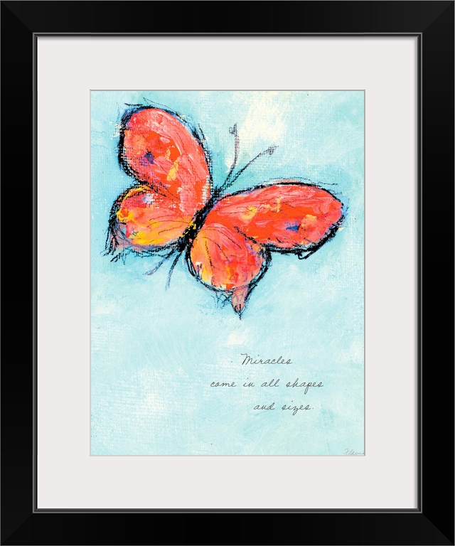 <p>Decorative artwork perfect for a home of a drawn butterfly over a pale blue sky. It contains an inspirational quote just to the bottom right of the butterfly.</p>