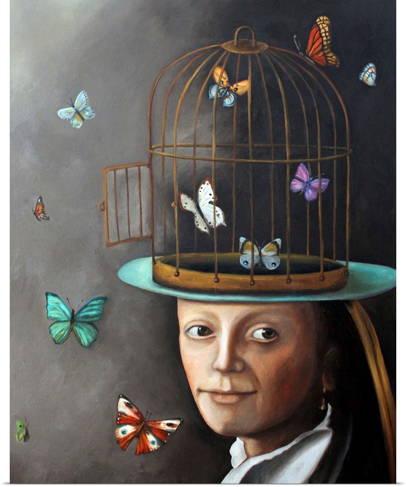 <p>Surrealist painting of a woman with the top half of her head as a cage with butterflies flying all around.</p>
