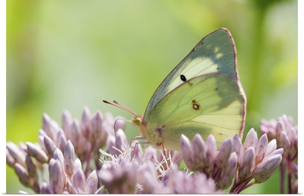 <p>A female clouded or common sulfur butterfly, Colias philodice, pollinating Joe pye weed flowers, Eupatorium species. McClennen Park, Arlington, Massachusetts.</p>