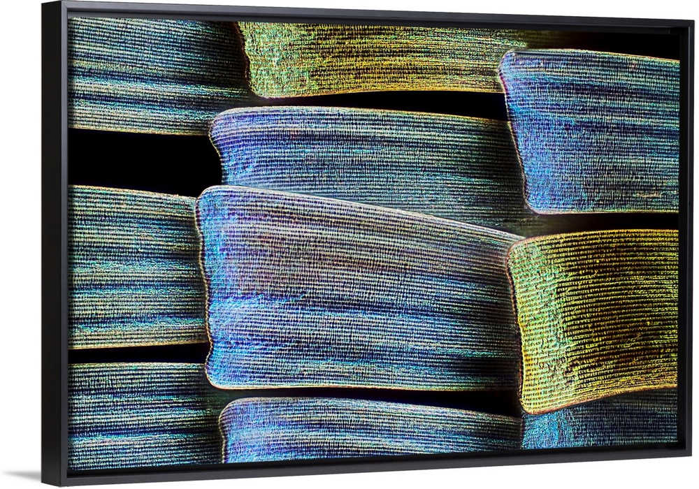 <p>Butterfly wing scales. Light micrograph of scales on the wing of a butterfly. The colour of a butterfly or moth's wing can arise either from a pigment contained in the scales or from iridescence produced by the actual structure of the scales themselves. This iridescence is produced by the diffraction of light by the microscopic structure of these scales. Magnification: x114 when printed at 10 centimetres across.</p>