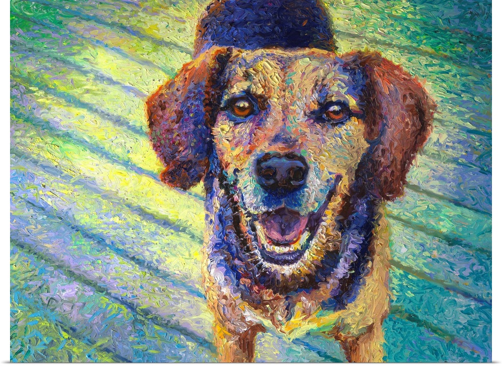 <p>Brightly colored contemporary artwork of a happy dog.</p>