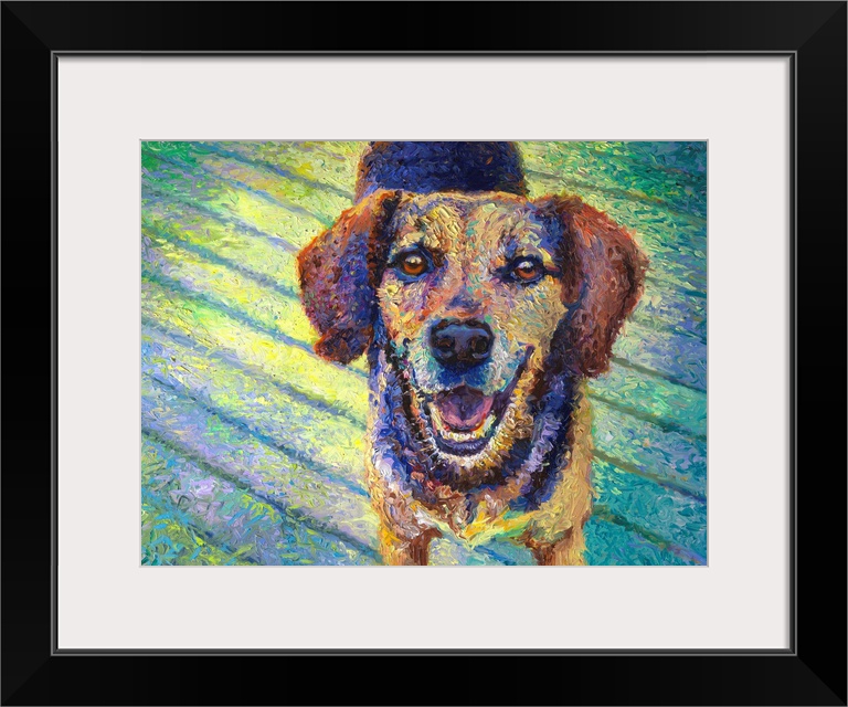 <p>Brightly colored contemporary artwork of a happy dog.</p>