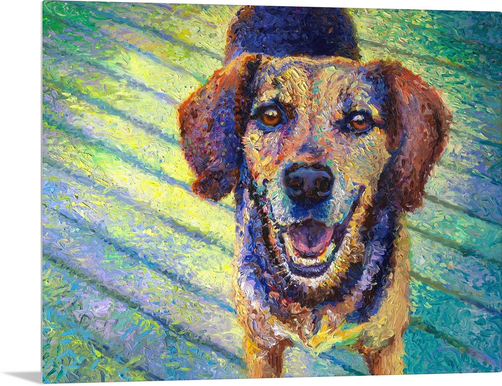 <p>Brightly colored contemporary artwork of a happy dog.</p>