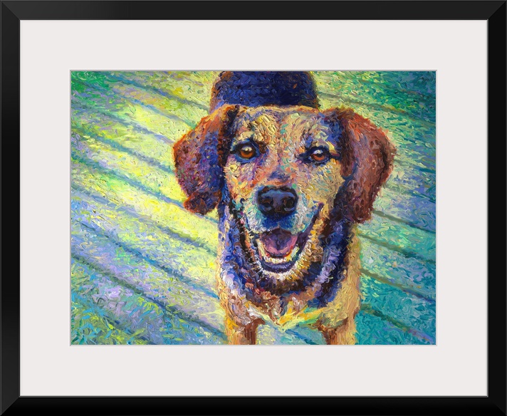 <p>Brightly colored contemporary artwork of a happy dog.</p>