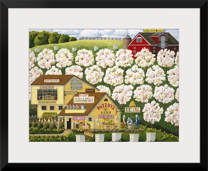 <p>Americana scene of a beekeeper selling honey and beekeeping supplies next to a blooming orchard.</p>