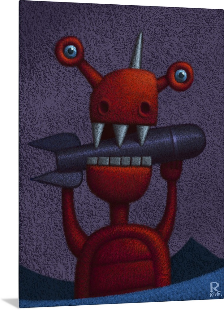 <p>We all choose to eat things that give us a kick or satisfy a craving, but sometimes those things bite back. Contemporary painting of a red creature eating a missile.</p>