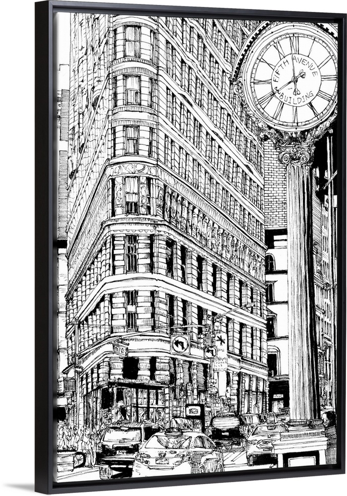 <p>Illustrated cityscape of New York City with taxi cabs and a street clock.</p>