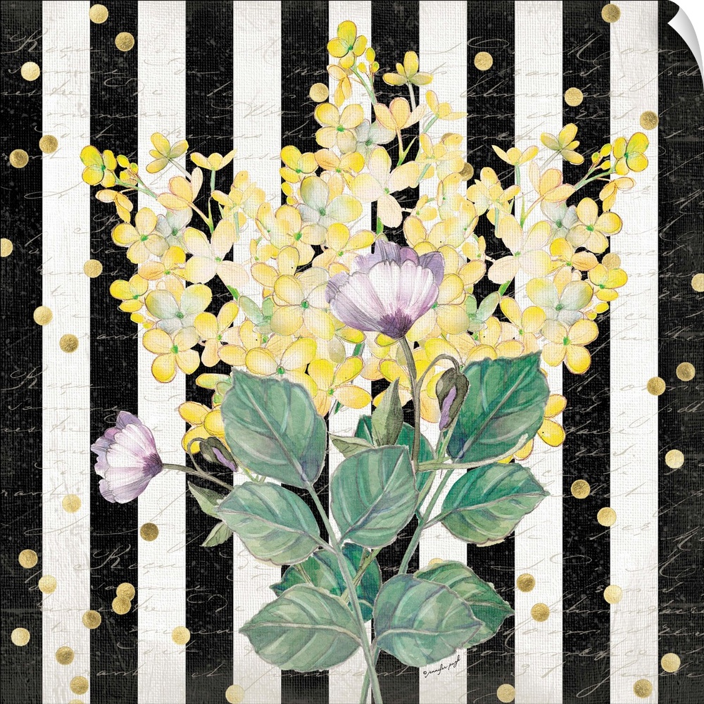 <p>Contemporary artwork of colorful flowers against a black and white striped background with golden dots covering the image.</p>