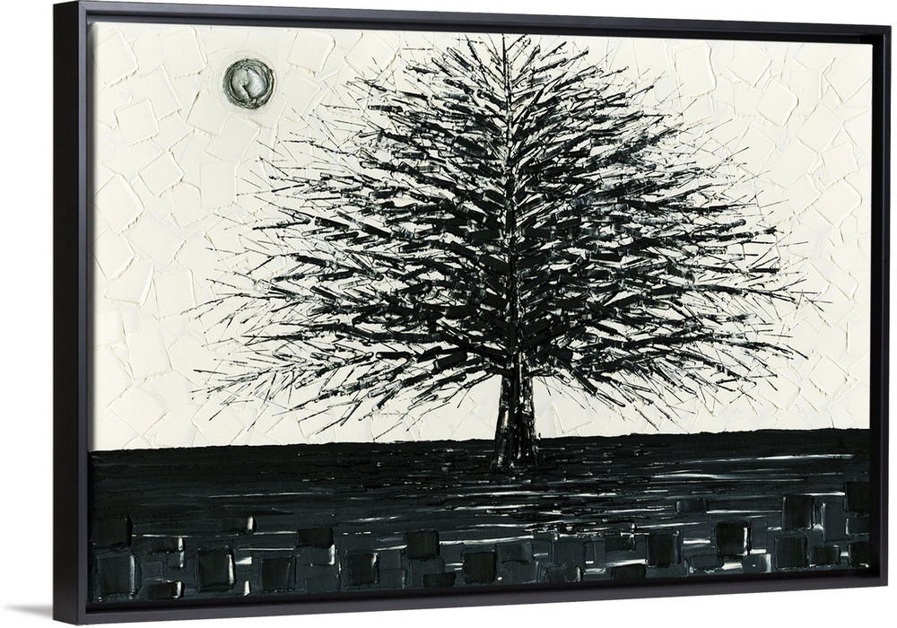 <p>Black and white tree landscape with layers of squares in the background.</p>
