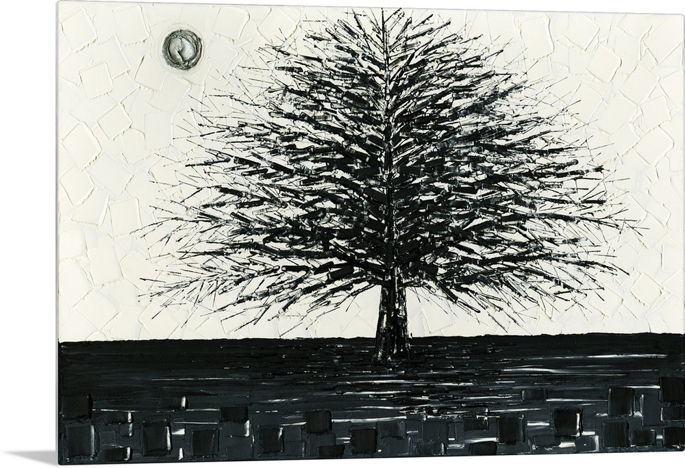 <p>Black and white tree landscape with layers of squares in the background.</p>