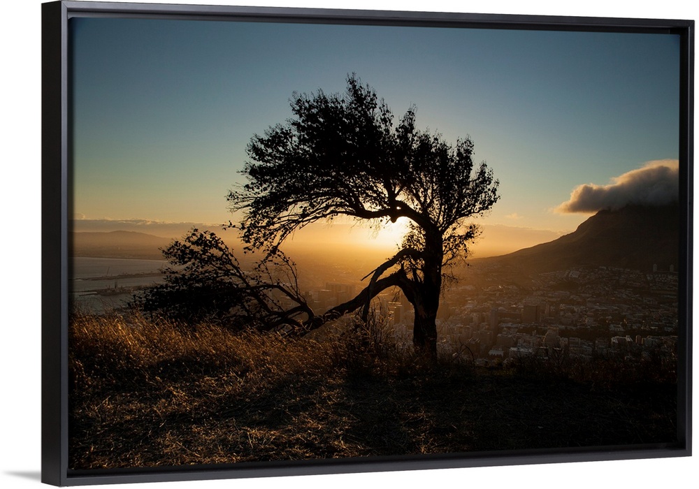 <p>A photo of a lone tree with a broken limb on a hill over a city with the sun shining behind.</p>