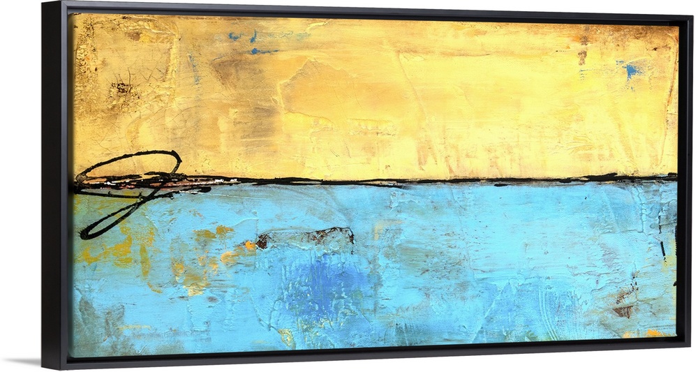<p>Horizontal abstract painting split into two sections of light blue and yellow with heavy distressing and paint drips throughout.</p>