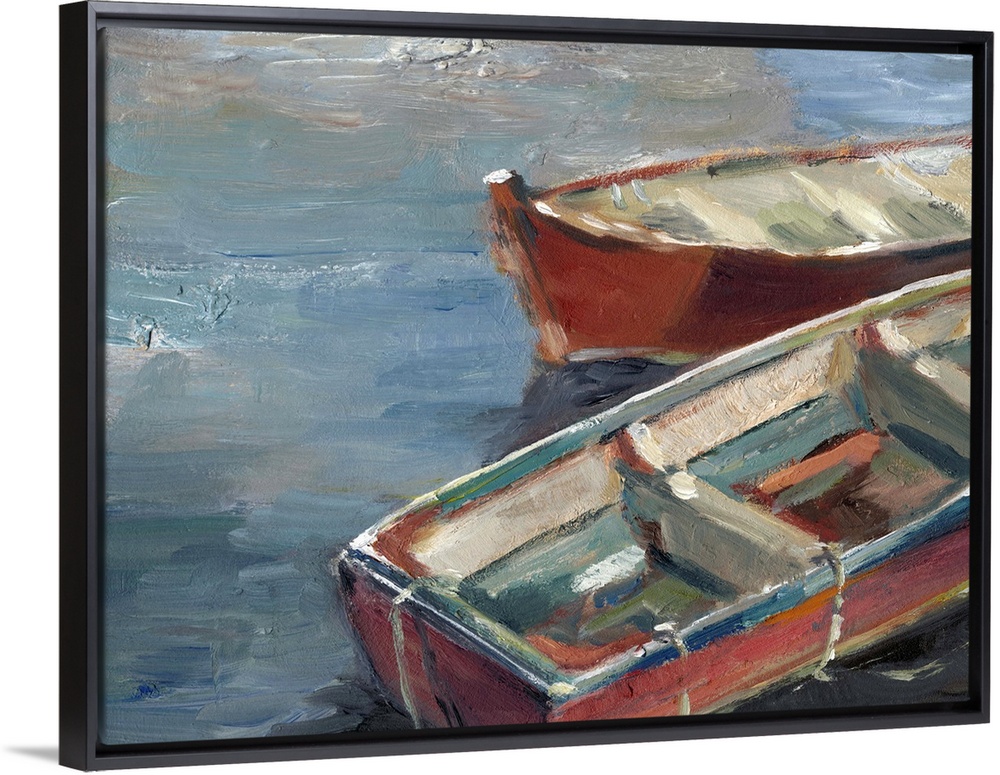 <p>Contemporary painting of red rowboats sitting on the water.</p>
