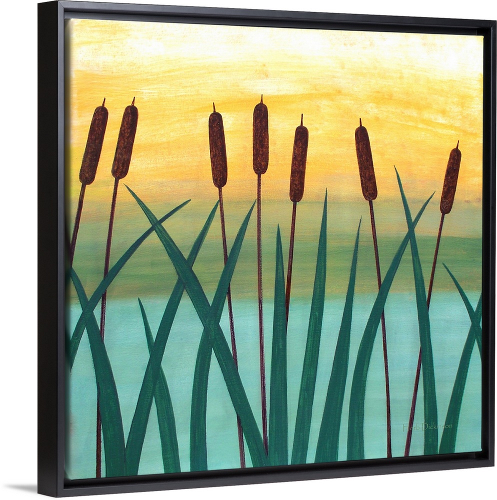 <p>Square painting of cattails by the river with blue, green, brown, and yellow hues.</p>