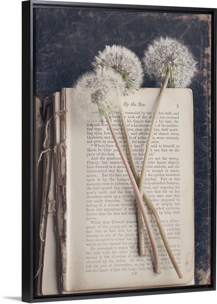 <p>A photograph of three dandelions on top of a vintage book.</p>