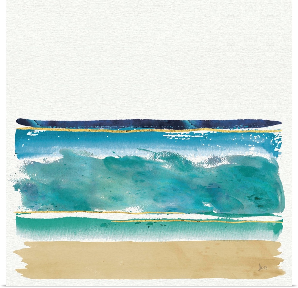 <p>Watercolor painting of the ocean and sandy beach.</p>