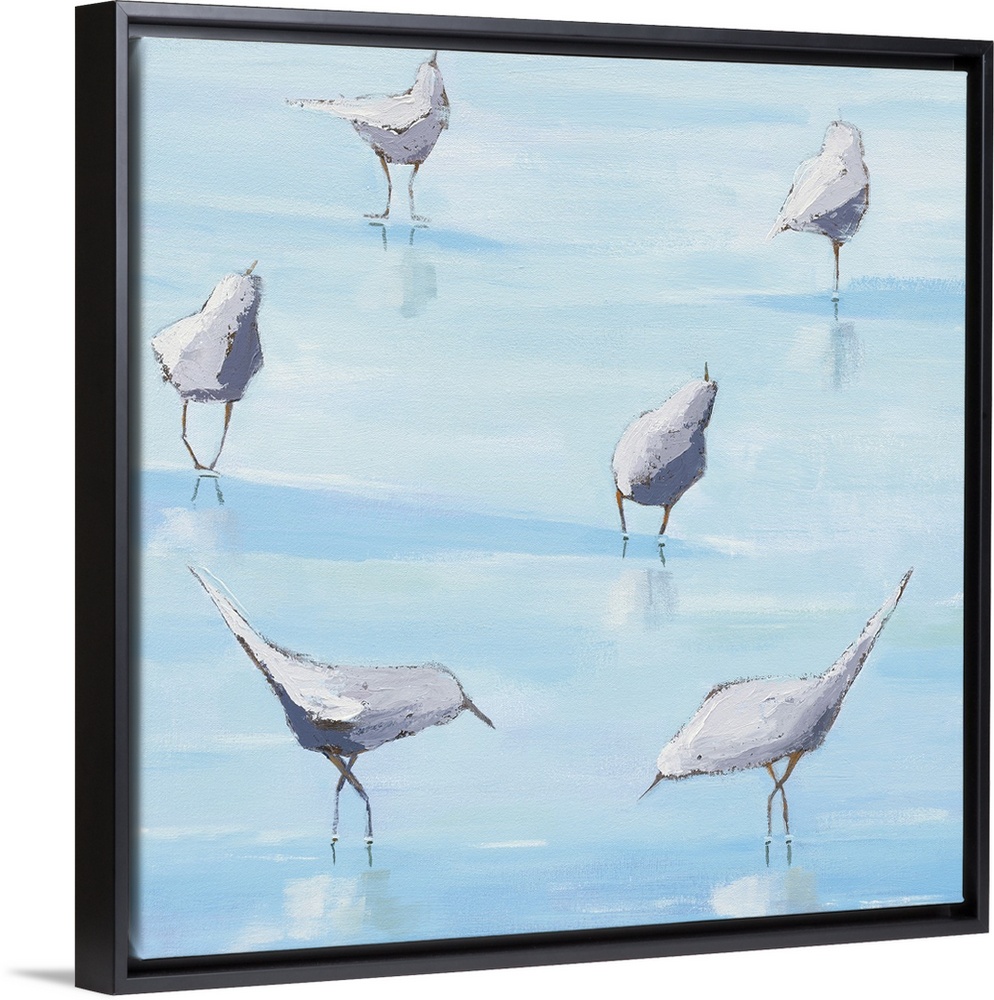 <p>Square abstract painting of six shorebirds exploring the shallow ocean waters.</p>