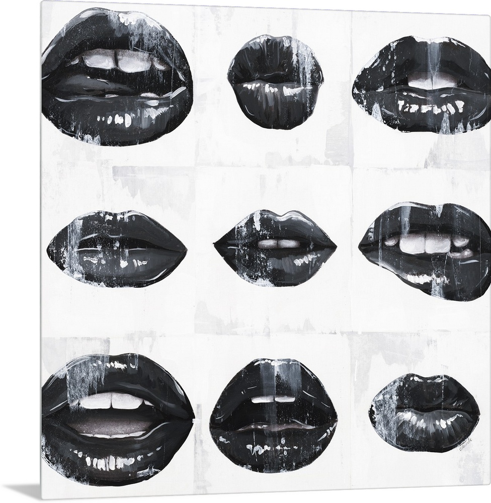 <p>Square art with black and white mouths open in different ways on a white background with paint drip.</p>