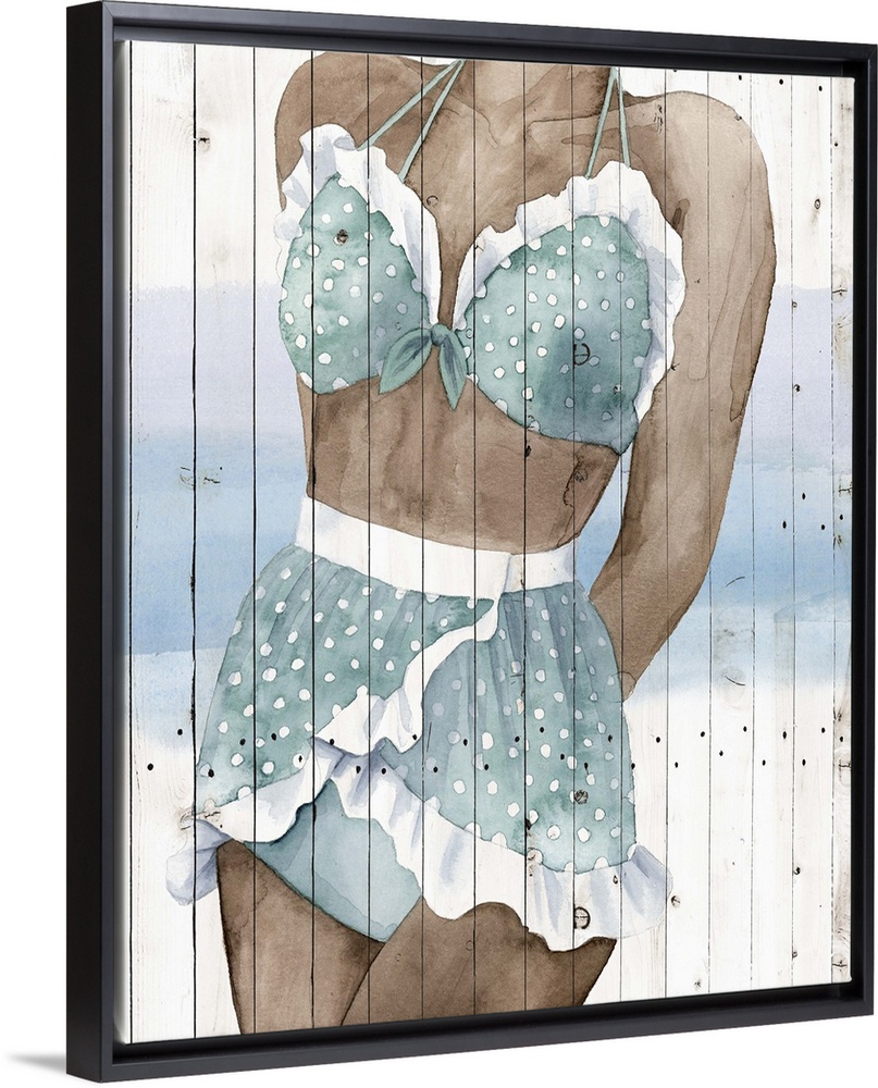 <p>Mid-height portrait of a woman wearing a vintage bathing suit on a board background.</p>