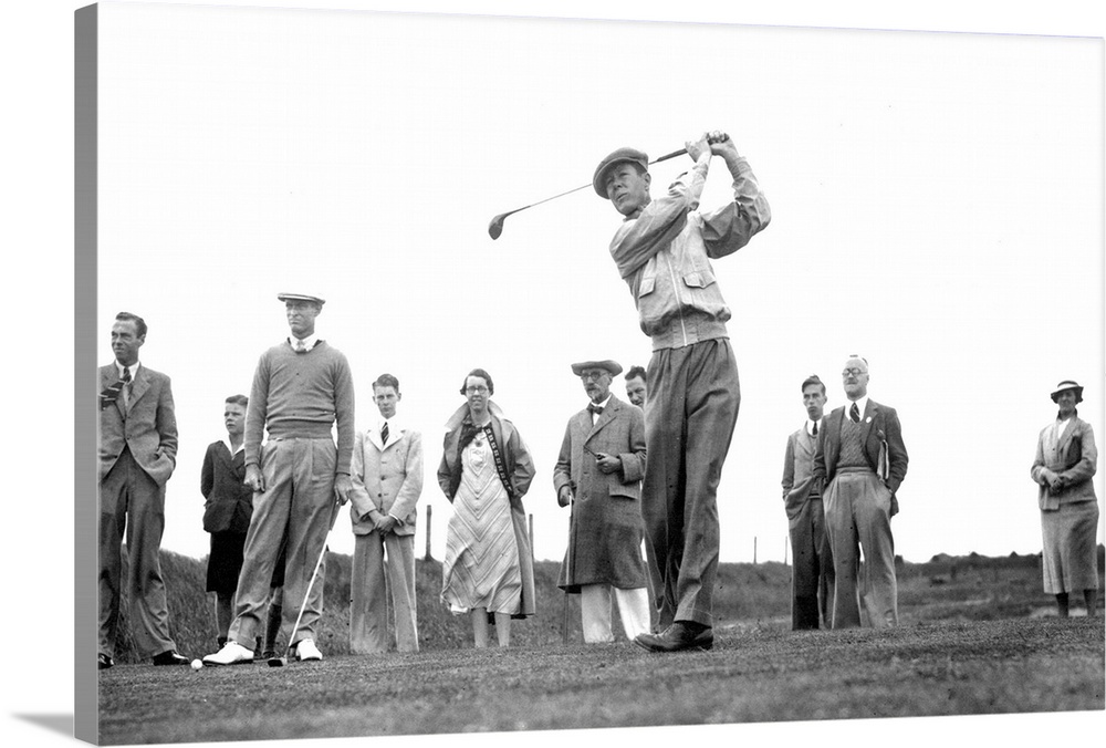 <p>24th June 1937: US golfer Byron Nelson competing in a Ryder Cup match at Royal Birkdale, Southport Teammate Densmore 'Denny' Shute stands on the left, holding a club</p>