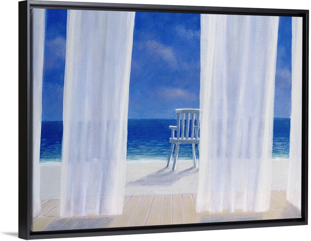 <p>Fantastic wall art for a beach house this contemporary landscape painting looks out to sea through curtains blowing in the breeze at a chair sitting on a beach.</p>