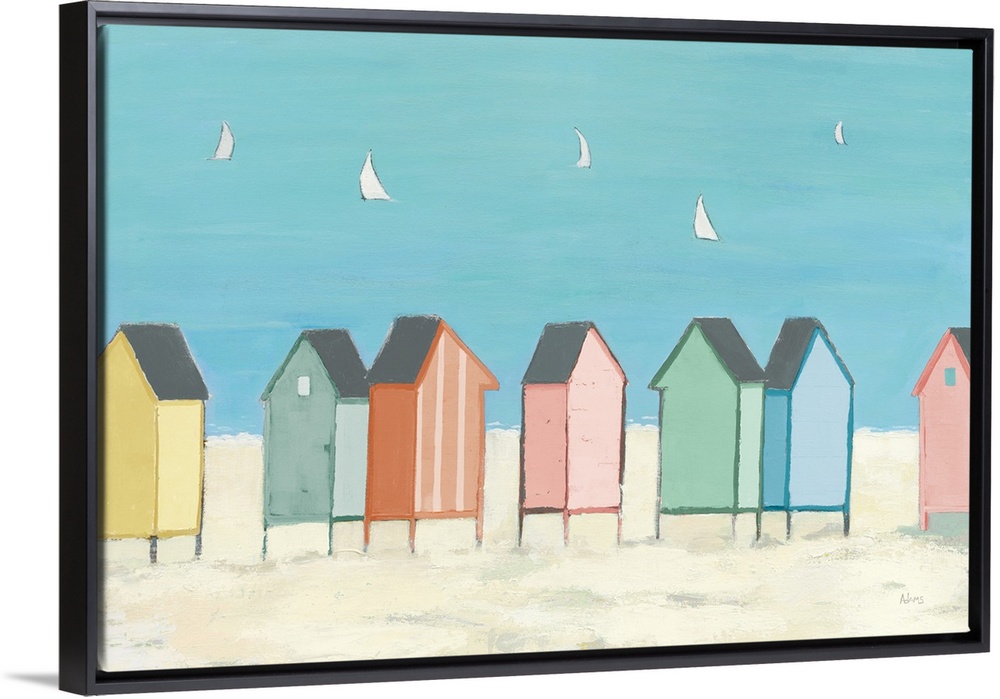<p>Decorative artwork of colorful sea shacks at the beach with sailboats floating in the distance.</p>