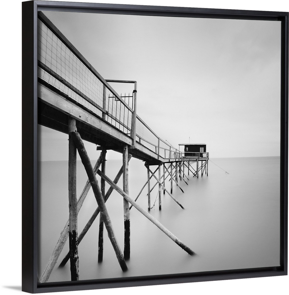<p>Cabane, pier, water, fog, black and white photography</p>