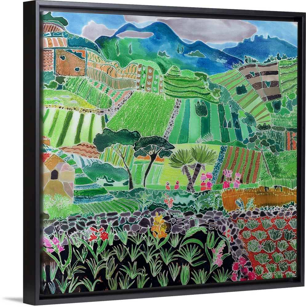 <p>Contemporary painting of an agricultural landscape with mountains in the distance.</p>