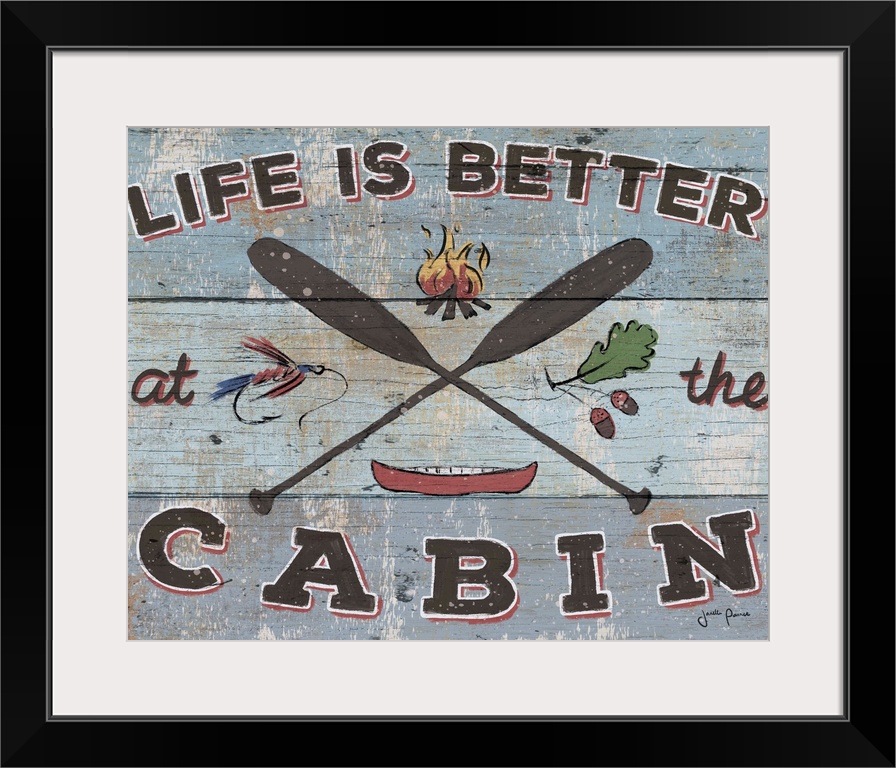 <p>Vintage style image on a wooden board background of crossed paddles and "Life is Better at the Cabin."</p>