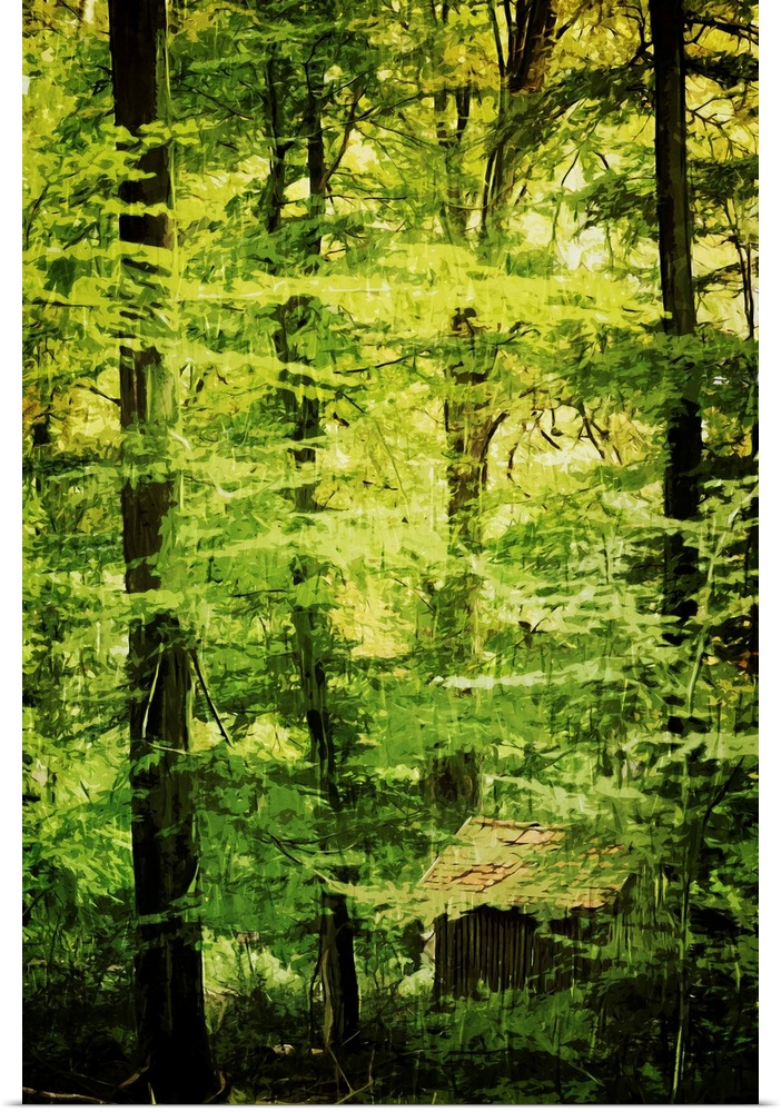 <p>Fine art photo of cabin hidden in the green foliage of a dense forest.</p>