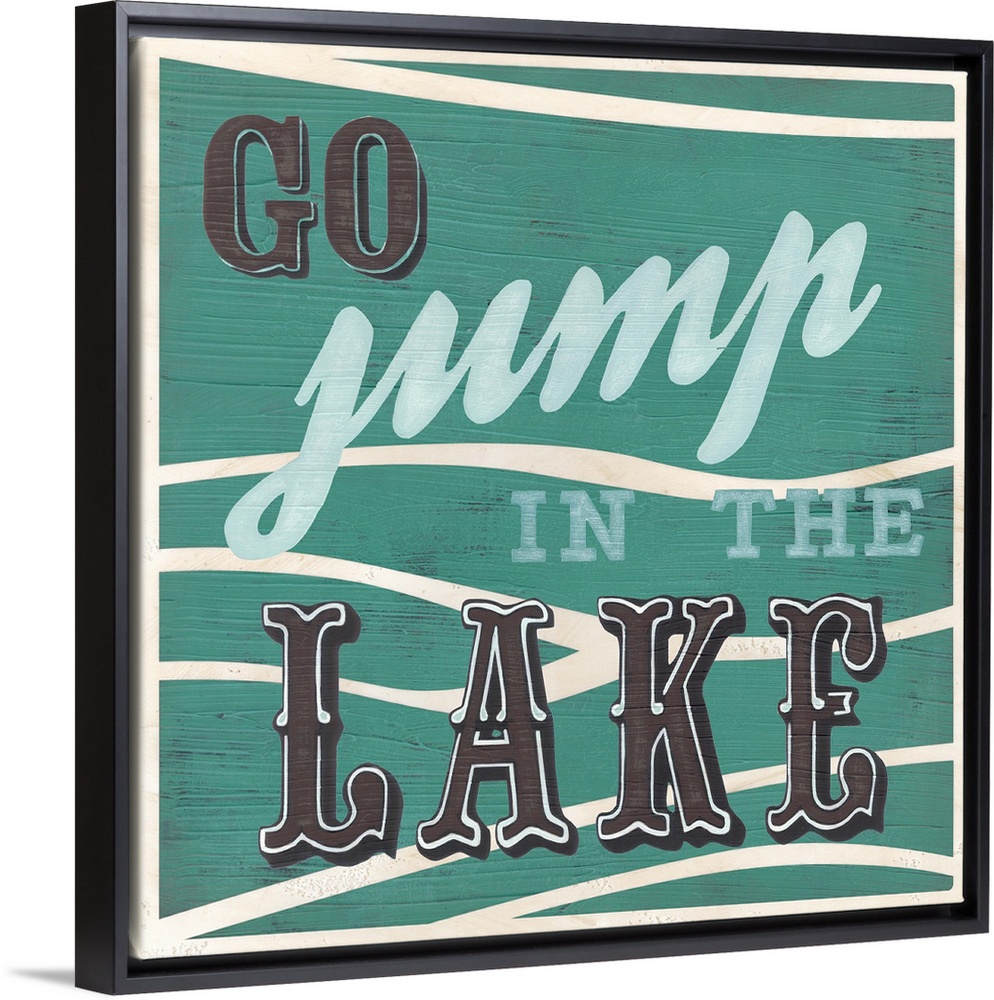 <p>Decorative sign for a cabin or lodge that reads "Go Jump In The Lake."</p>