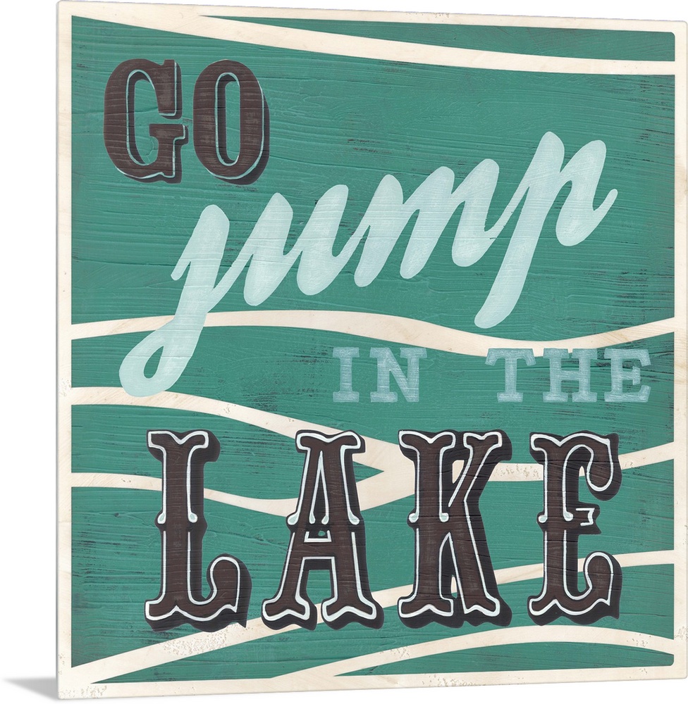 <p>Decorative sign for a cabin or lodge that reads "Go Jump In The Lake."</p>