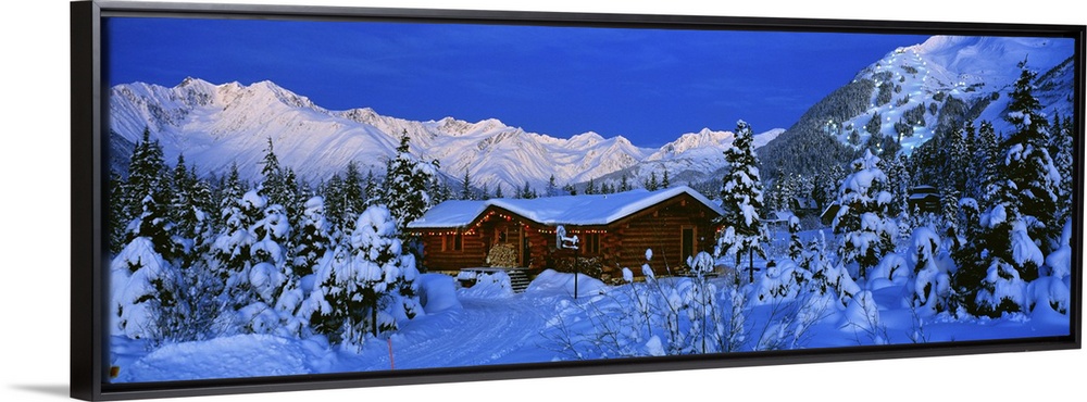 <p>Panoramic photograph of wooden log house nestled in snow covered forest with snow covered mountains in the distance under a clear sky.</p>