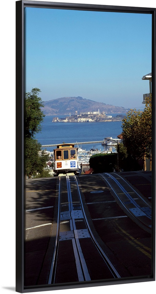 <p>Vertical panoramic photograph of street trolley moving toward the horizon with harbor, waterfront, and mountains in the distance.</p>