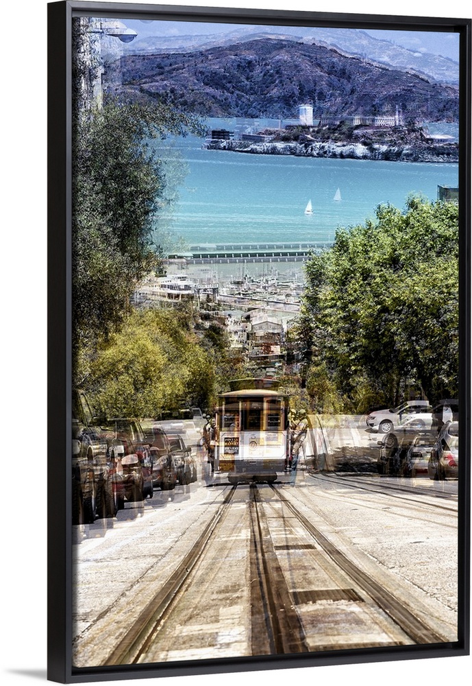 <p>Tram going up a hill in San Francisco with a view of the bay with a layered effect creating a feeling of movement.</p>